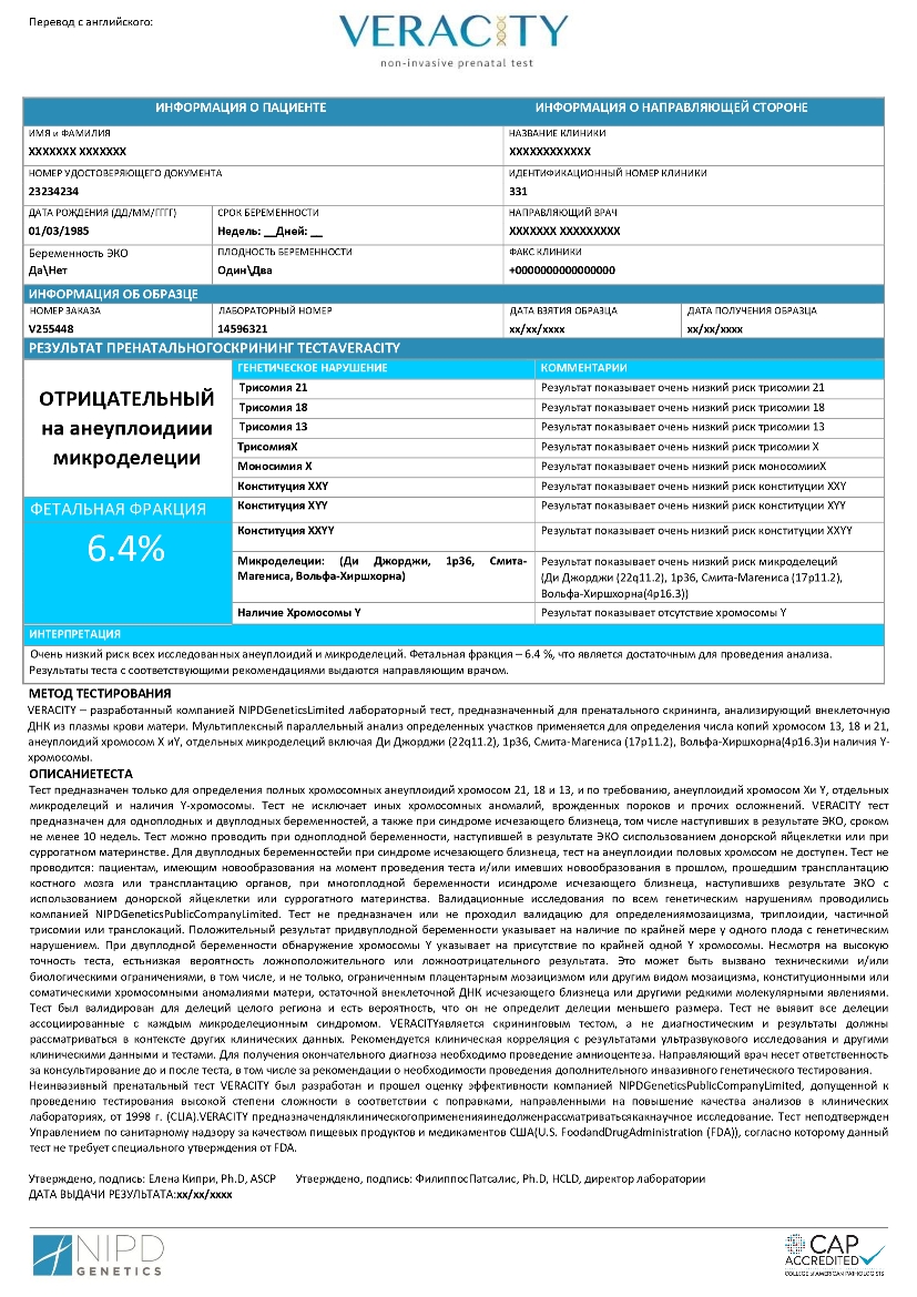 Обратите внимание: НИПТ — не является терапевтической услугой, консультацией по вопросам фармацевтики и медицинской помощью, аппаратом для диагностических целей и медицинских анализов, медицинским прибором, инструментом, аппаратурой для анализов, медицинской услугой.